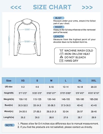 Moisture Wicking & Flatlock Seams Design: Womens rash guards long sleeve wick away the sweat and allow for the airflow to keep you cool and dry in the hot weather. UV protection clothing women also boast a tag-free design and flatlock seams, which minimize friction and increase comfort.